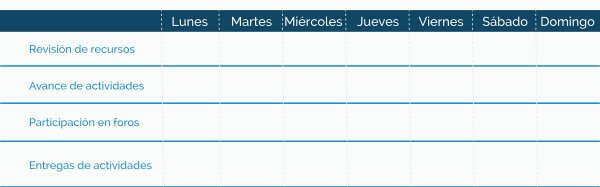 Cada proyecto es diferente, por lo que se requieren tiempos distintos para el desarrollo de cada fase; por esta razón te invitamos a organizar tu tiempo por semana haciendo uso del siguiente calendario para cada fase. Recuerda considerar las entregas de tus avances, revisión de recursos y participación en foros.